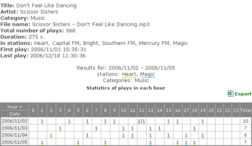 Just load your new release into the system with a few mouse-clicks and Stirlitz Media Inspector does the rest. From now on you can see which stations are spinning your record, from your desktop and from wherever you are. With Stirlitz Media Inspector you can create customized reports for on screen usage and downloads. Standard reports include: